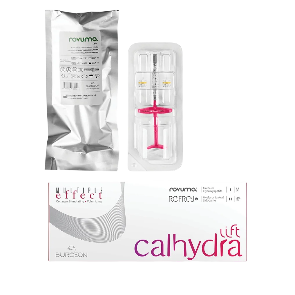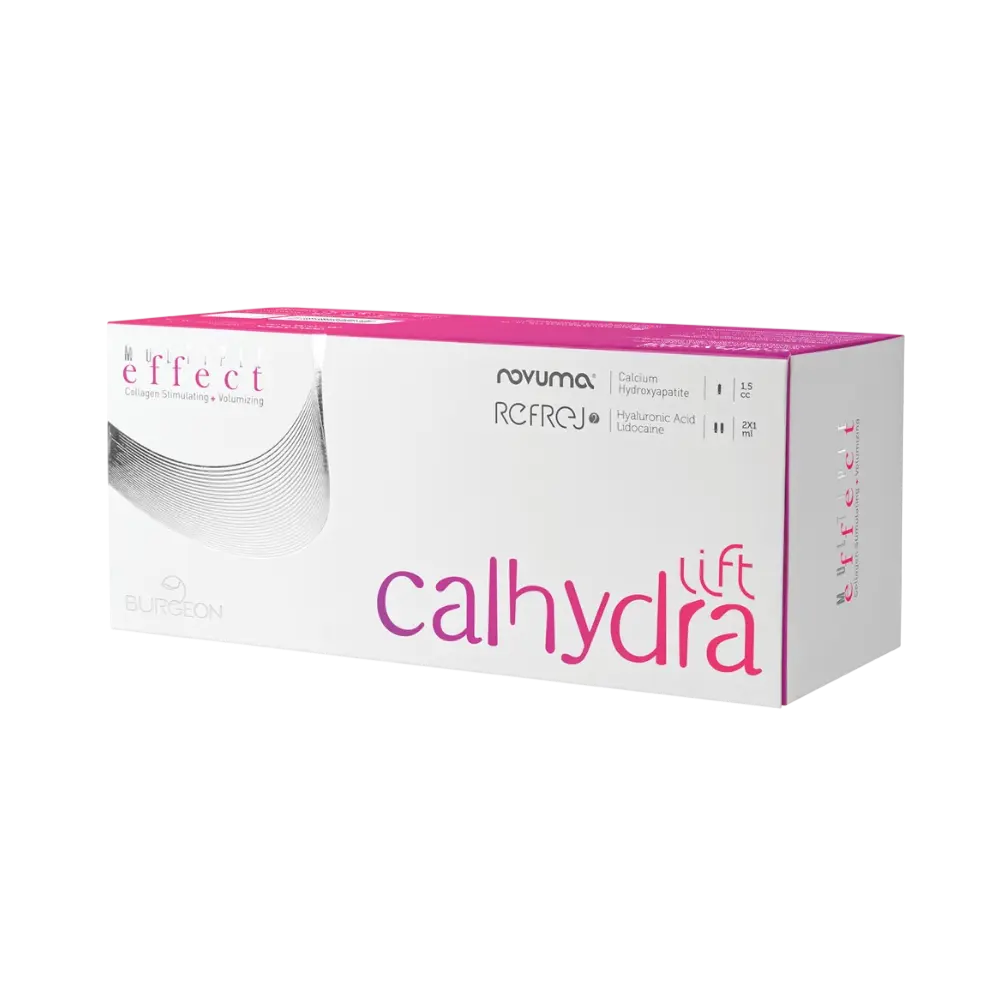 Calhydra Lift (brand Burgeon, Turcia) este o variantă avansată a kit-ului injectabil inovator Calhydra, optimizată pentru **efect de lifting imediat și puternic**, prin combinația perfectă dintre Novuma (biostimulator pe bază de hidroxipatită de calciu – CaHA) și Refrej (acid hialuronic lightly cross-linked).