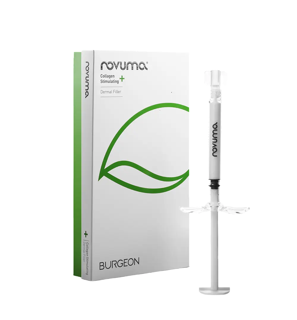 Novuma (brand Burgeon, Turcia) este un biostimulator injectabil avansat pe bază de hidroxipatită de calciu (CaHA) cu concentrație înaltă de microsfere (55-60%), suspendate în gel de carboximetilceluloză (CMC). Acționează dublu: oferă un efect imediat de lifting și hidratare datorită gelului carrier, urmat de stimularea progresivă a producției naturale de colagen și elastină pentru regenerare profundă.
