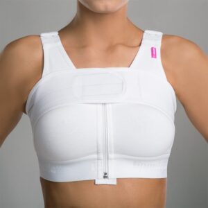 • Decolteul superior acoperă întregul pieptul și este conceput pentru a ajuta la stabilizarea poziției implanturilor de țesutul sânilor, exact așa cum cere chirurgul, dupa intervenția de mărire