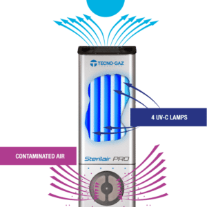 Sterilair PRO aspiră până la 120m3 de aer din mediul înconjurător pe oră, transportându-l către cele 4 lămpi UVC Philips care, datorită puterii lor germicide, tratează aerul înainte de a fi recirculat. Folosim lămpi cu vapori de mercur datorită nivelurilor lor excelente de performanță și deoarece radiațiile emise sunt absolut sigure pentru oameni.